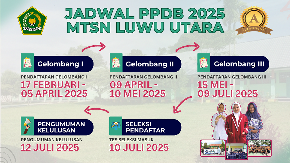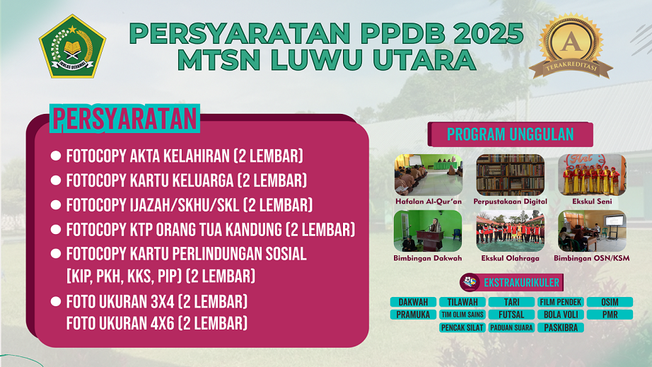 MTsN Luwu Utara menyediakan PPDB secara online diharapkan proses PPDB dapat berjalan cepat dan bisa dilakukan dimanapun dan kapanpun selama sesi PPDB Online dibuka. Proses pendaftaran calon siswa baru di masa pandemi Covid-19 ini dan terhambat oleh jarak jika datang ke madrasah langsung, bisa mengakses website PPDB Online MTsN Luwu Utara.